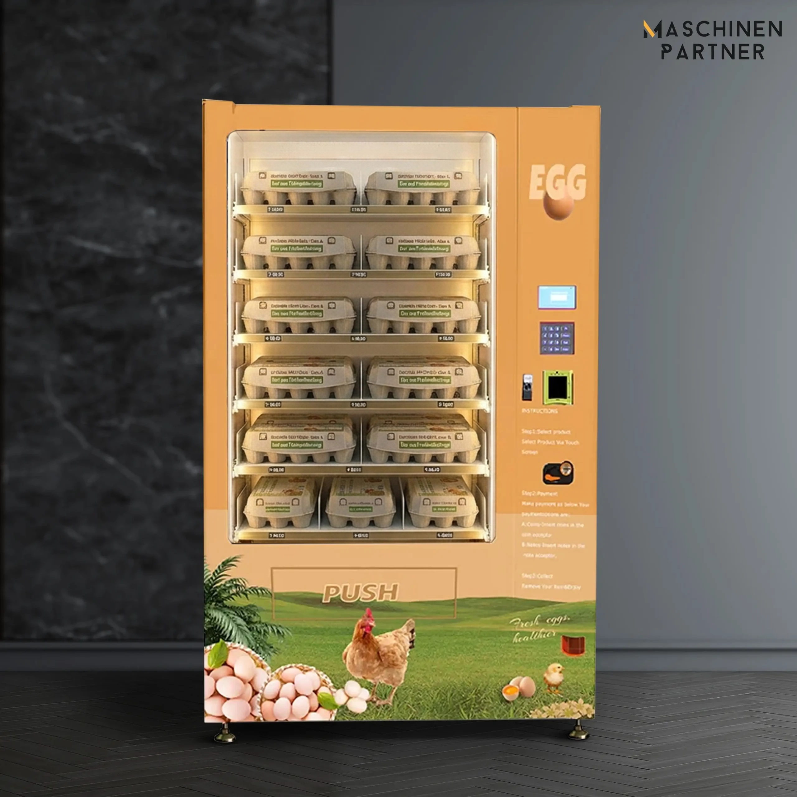 Ein herausragendes Merkmal dieses Eier-Verkaufsautomaten ist das Liftsystem. Es wurde entwickelt, um sicherzustellen, dass die Eier während des Kaufs nicht beschädigt werden. Diese innovative Technologie gewährleistet, dass die Eier in einwandfreiem Zustand beim Kunden ankommen.